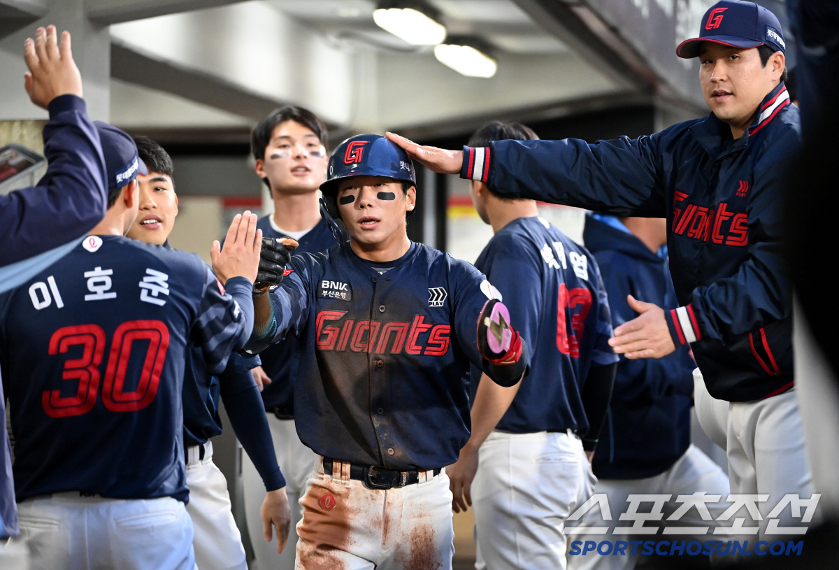 15일 광주KIA챔피언스필드에서 열린 롯데와 KIA의 경기, 3회초 1사 2,3루 롯데 고승민의 희생플라이때 선취득점에 성공한 3루주자 장두성이 기쁨을 나누고 있다. 광주=허상욱 기자wook@sportschosun.com