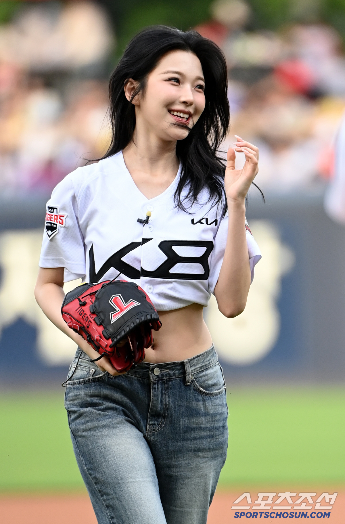 17일 광주KIA챔피언스필드에서 열린 두산과 KIA의 더블헤더 2차전 경기, 걸그룹 프로미스나인의 멤버 백지헌과 송하영이 시구와 시타를 맡았다. 힘차게 공을 던지는 백지헌의 모습. 광주=허상욱 기자wook@sportschosun.com/2025.05.17/