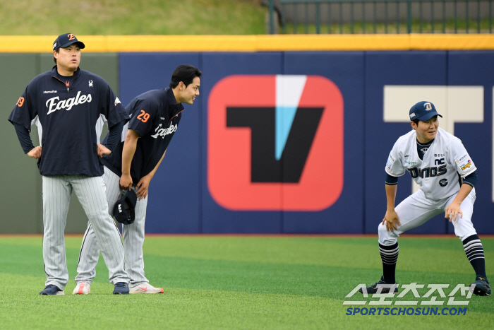 21일 울산 문수야구장에서 열린 NC 다이노스와 한화 이글스의 경기를 앞두고 외야 그라운드에서 만난 문동주와 박건우가 모두를 미소 짓게 만들었다.