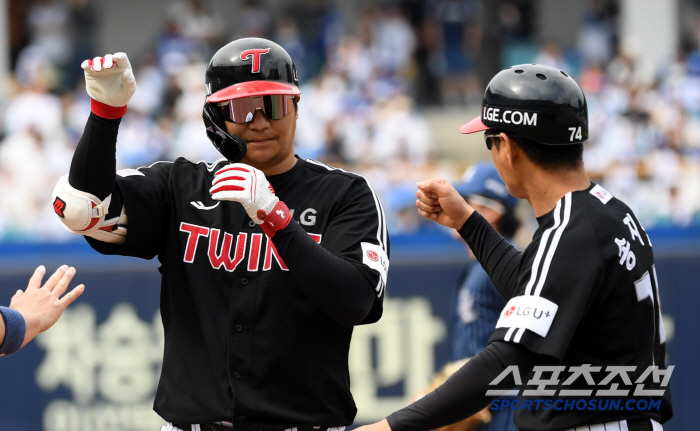 11일 대구 라이온즈파크에서 열린 삼성 라이온즈와 LG 트윈스의 경기. LG 문보경이 안타를 날린 뒤 환호하고 있다. 대구=박재만 기자 pjm@sportschosun.com/2025.05.11/