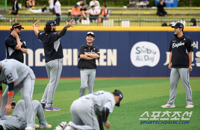 기분 좋은 승리 후 다음 날 그라운드에 나와 회복 훈련을 하는 동안에도 문동주는 폰세 곁을 떠날 생각이 없었다. 폰세에게 권투 흉내를 내며 애교를 부린 문동주. 형님 폰세는 동생의 귀여운 애교에 연신 웃었다.