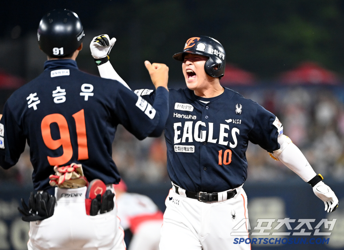 7일 광주KIA챔피언스필드에서 열린 한화와 KIA의 경기,연장 11회초 2사 2루 한화 이진영이 1타점 적시타를 치고 환호하고 있다. 광주=허상욱 기자wook@sportschosun.com