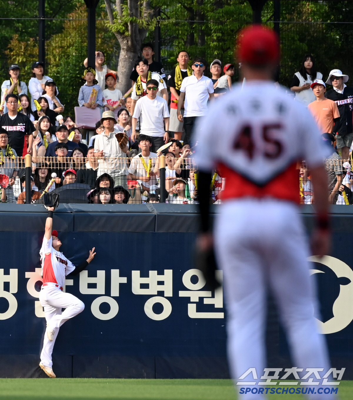8일 광주 KIA챔피언스필드에서 열린 한화와 KIA의 경기, 1회초 1사 2,3루 KIA 좌익수 김석환이 한화 노시환의 플라이 타구를 펜스에 기대어 잡아내고 있다. 광주=허상욱 기자wook@sportschosun.com