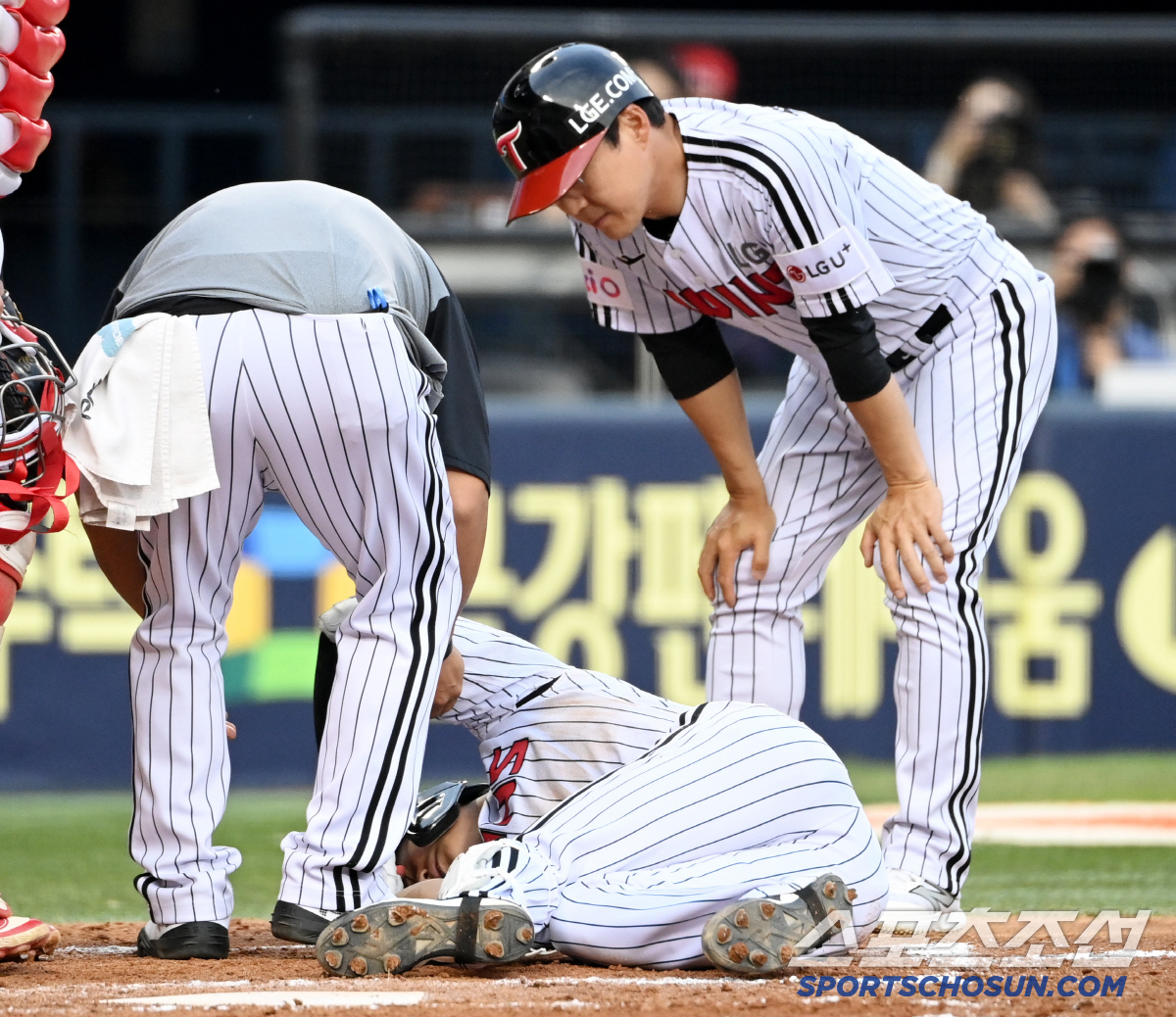 12일 잠실야구장에서 열린 SSG와 LG의 경기, 2회말 LG 구본혁이 SSG 전영준의 투구를 손에 맞은 후 고통스러워 하고 있다. 잠실=허상욱 기자wook@sportschosun.com