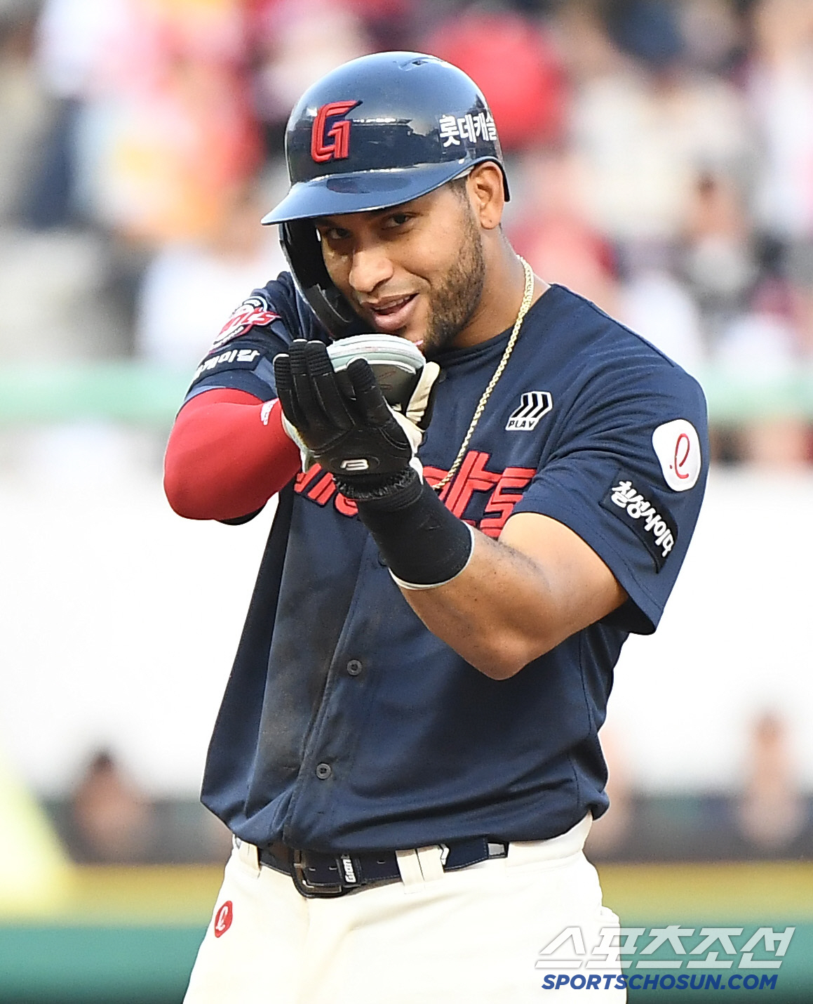 14일 인천 SSG랜더스필드에서 열린 롯데-SSG전. 8회초 2사 1, 3루 전준우가 1타점 적시타를 치자 레이예스가 박수를 보내고 있다. 인천=정재근 기자 cjg@sportschosun.com