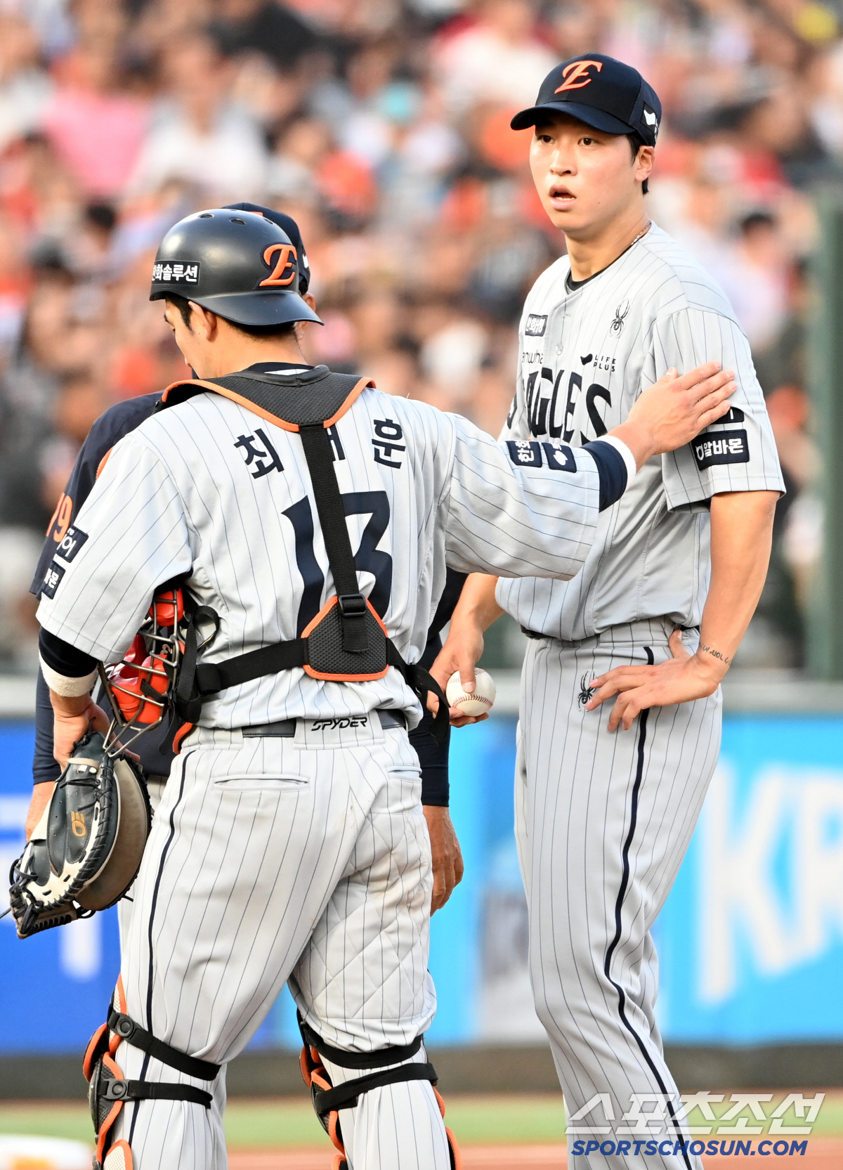 18일 부산 사직야구장에서 열린 한화와 롯데의 경기, 2회말 2사 1루 한화 엄상백이 롯데 김동혁에 안타를 내준 후 이어진 실책으로 실점하자 양상문 투수코치와 최재훈이 마운드에 올라와 이야기를 하고 있다. 부산=허상욱 기자wook@sportschosun.com