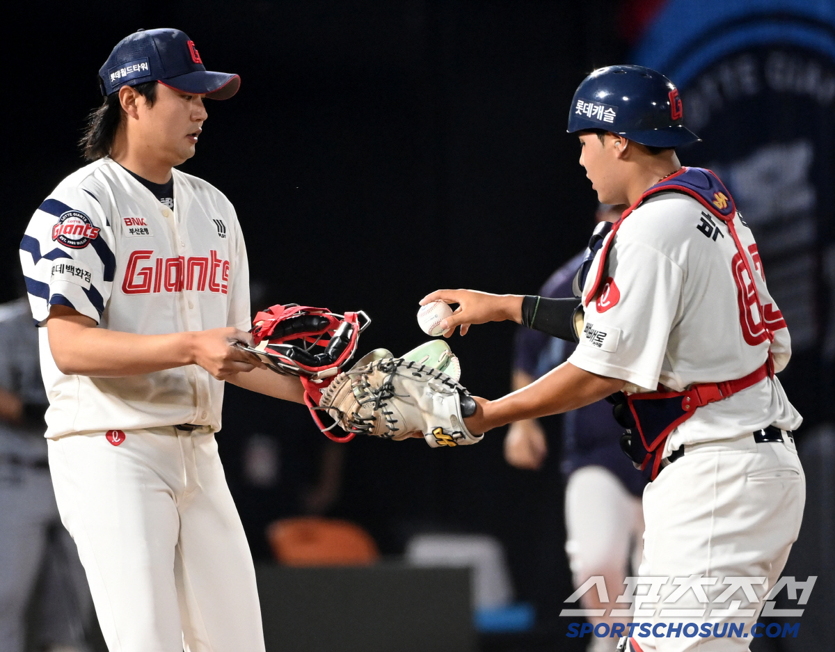 18일 부산 사직야구장에서 열린 한화와 롯데의 경기, 8회초 무사 2루 롯데 포수 박재엽이 한화 이원석의 파울 플라이를 호수비로 잡아낸 후 정철원에게 장비를 건네받고 있다. 부산=허상욱 기자wook@sportschosun.com