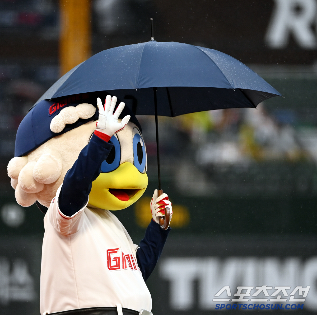 21일 부산 사직야구장에서 열릴 예정이던 삼성과 롯데의 경기가 우천으로 취소됐다. 팬들에게 인사를 하는 롯데 마스코트 누리의 모습. 부산=허상욱 기자wook@sportschosun.com/2025.06.21/