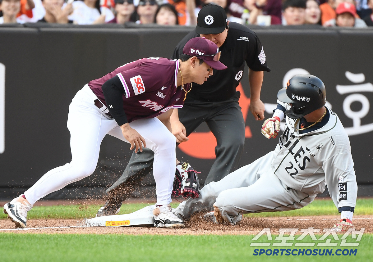 22일 대전 한화생명볼파크에서 열린 키움-한화전. 2회초 무사 2루 안치홍의 희생번트 때 채은성이 3루에서 세이프되고 있다. 대전=정재근 기자 cjg@sportschosun.com