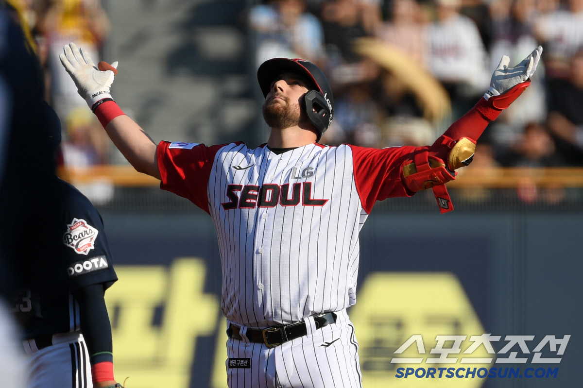 22일 잠실구장에서 열린 LG 트윈스와 두산 베어스의 경기. 2회말 1사 1루 LG 오스틴이 안타를 날린 뒤 환호하고 있다. 잠실=박재만 기자 pjm@sportschosun.com