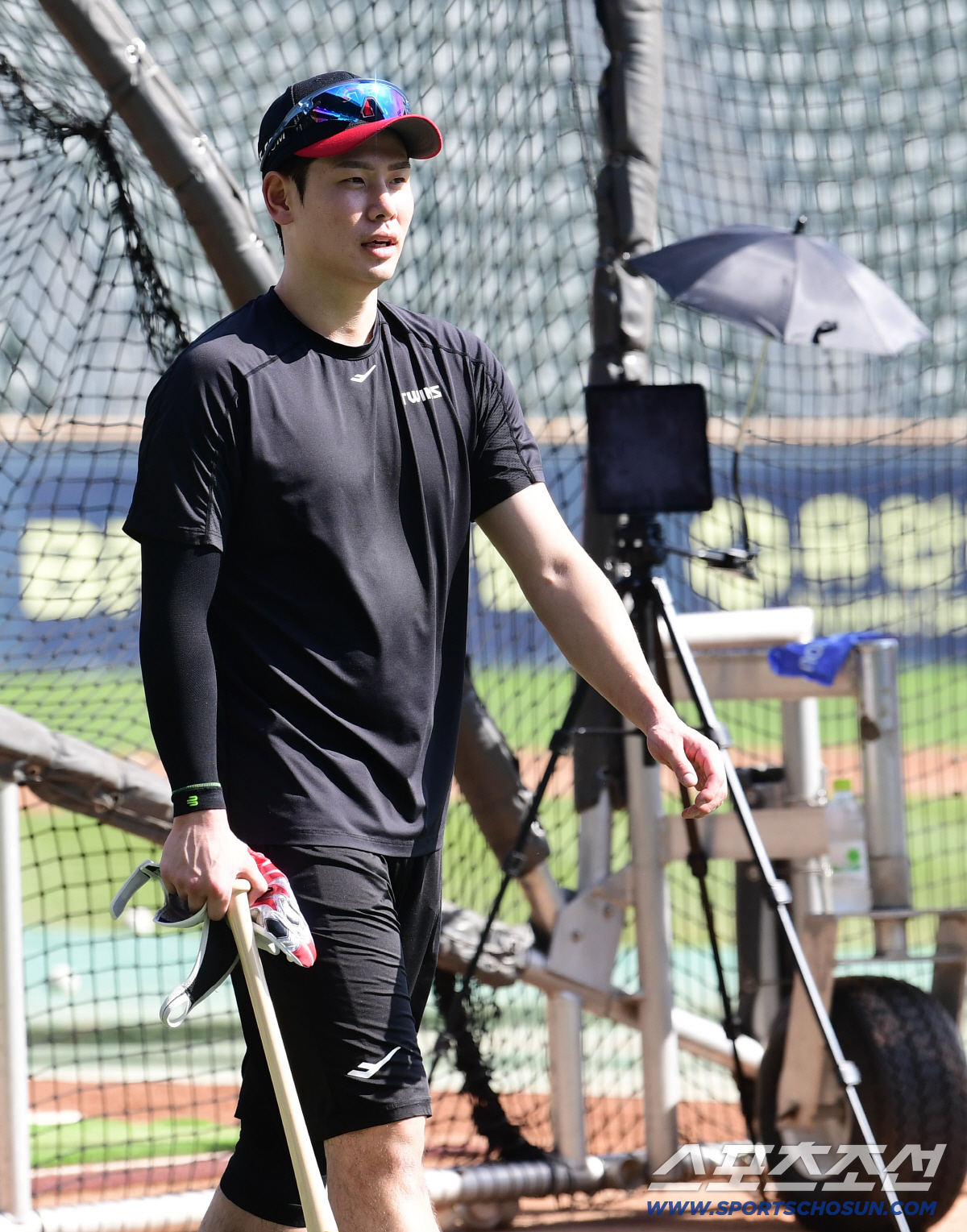 30일 잠실구장에서 열리는 LG와 키움의 경기. 동료들이 지켜보는 가운데 타격 훈련을 하고 있는 LG 홍창기. 잠실=송정헌 기자songs@sportschosun.com