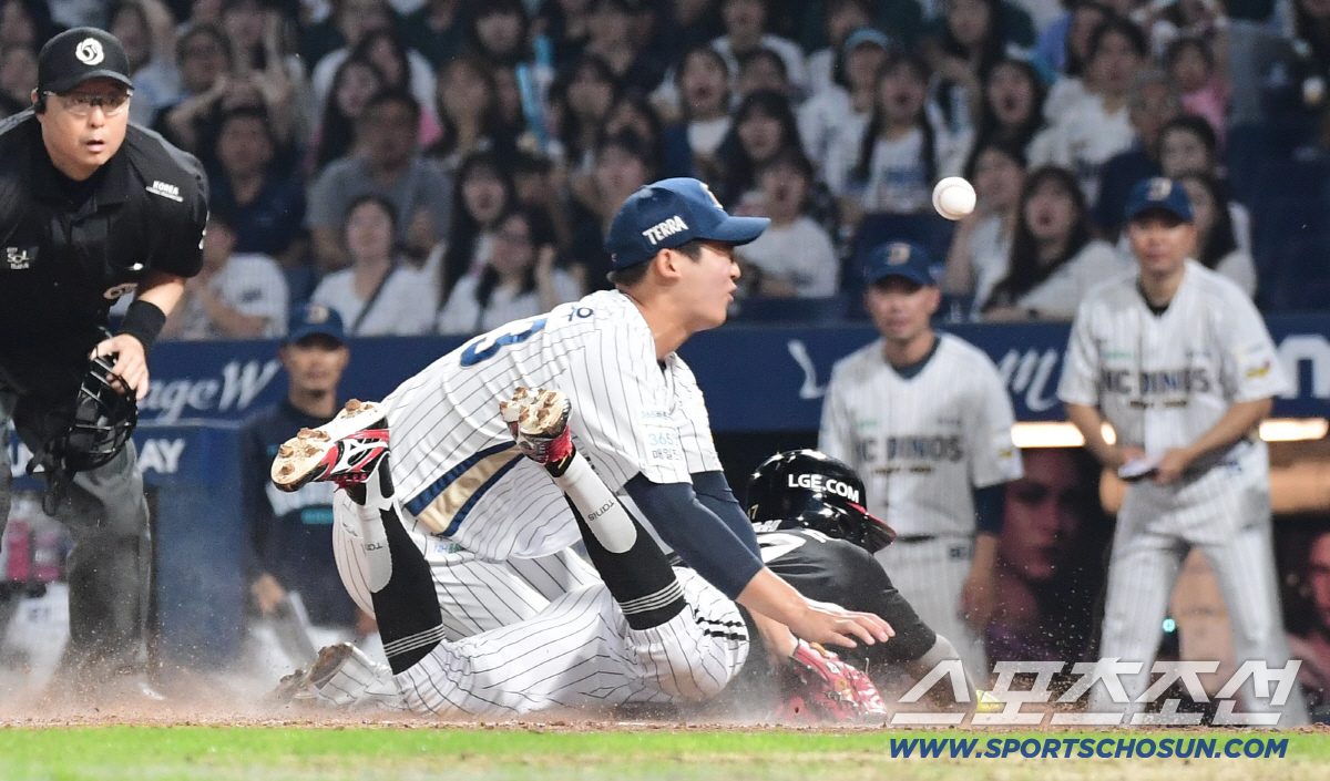 24일 창원 NC파크에서 열린 KBO리그 NC와 LG의 경기. 5회초 1사 2, 3루. NC 신영우 폭투 때 3루주자 박해민이 득점에 성공했다. NC 신영우와 충돌하며 득점에 성고하고 있는 박해민. 창원=송정헌 기자songs@sportschosun.com