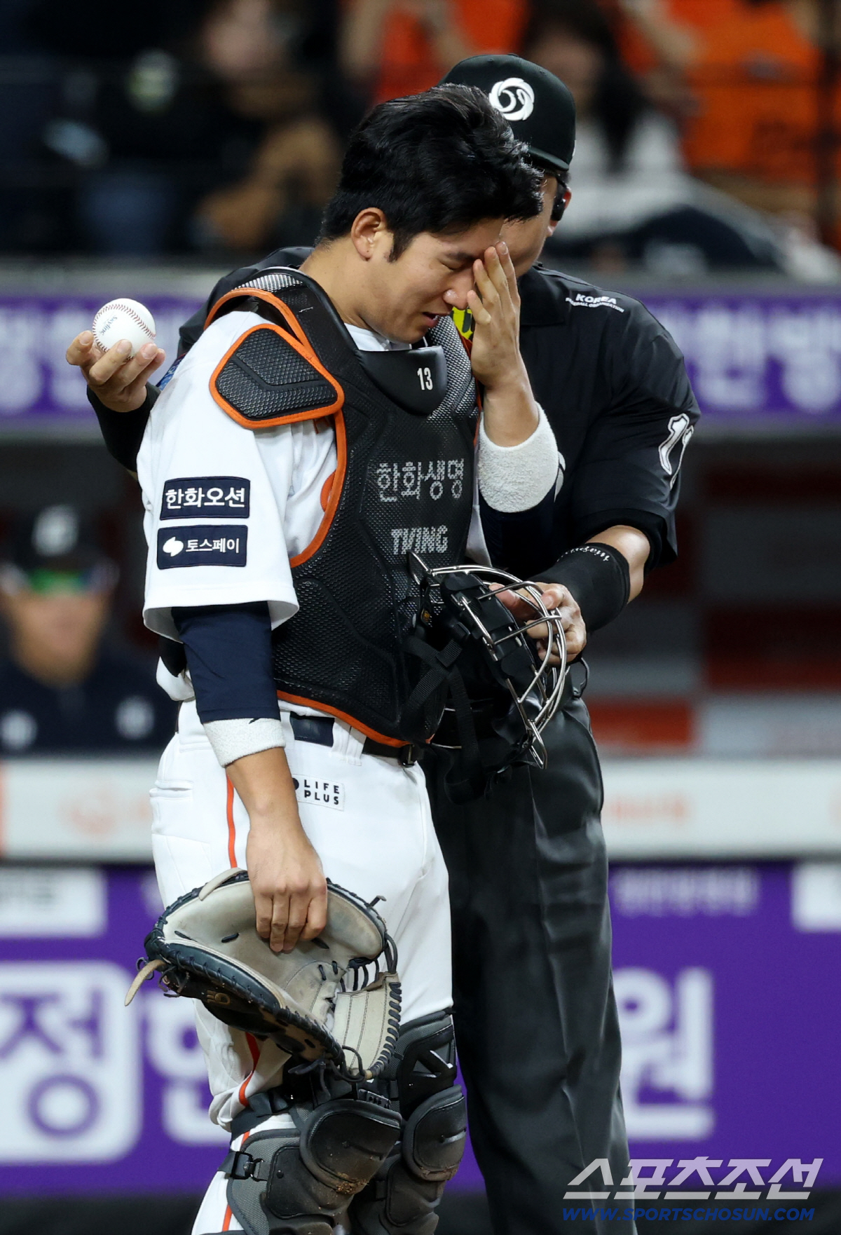 30일 대전한화생명볼파크에서 열린 롯데와 한화의 경기, 3회초 한화 포수 최재훈이 롯데 한태양의 파울 타구를 마스크에 직격당하며 괴로워하고 있다. 대전=허상욱 기자wook@sportschosun.com/2025.09.30/