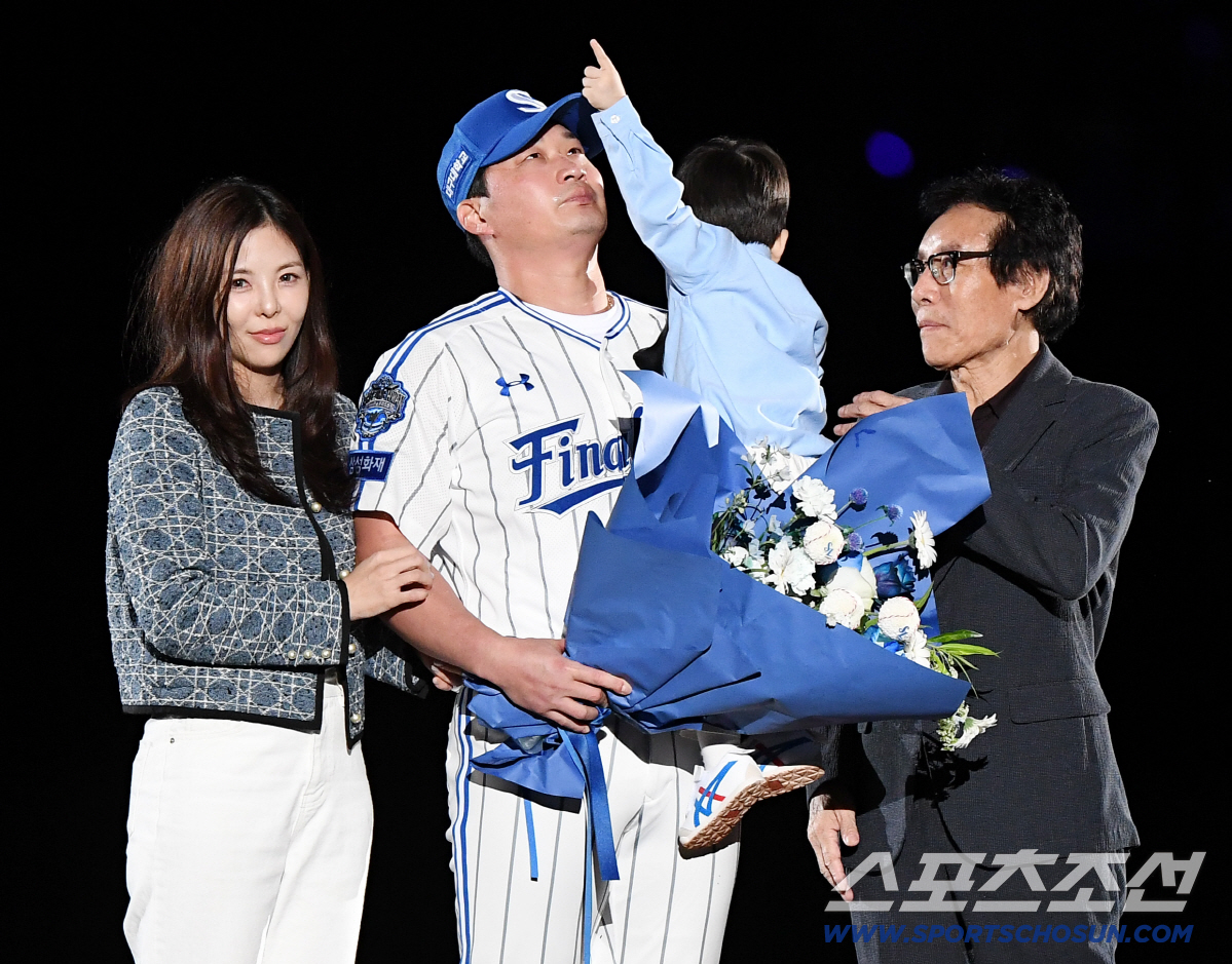 30일 대구 라이온즈파크에서 오승환의 은퇴식이 열렸다. 오승환의 부친, 아내, 아들이 함께 한 자리에서. 아들 서준 군이 아빠의 세리머니를 따라하고 있다. 대구=정재근 기자 cjg@sportschosun.com/2025.9.30/