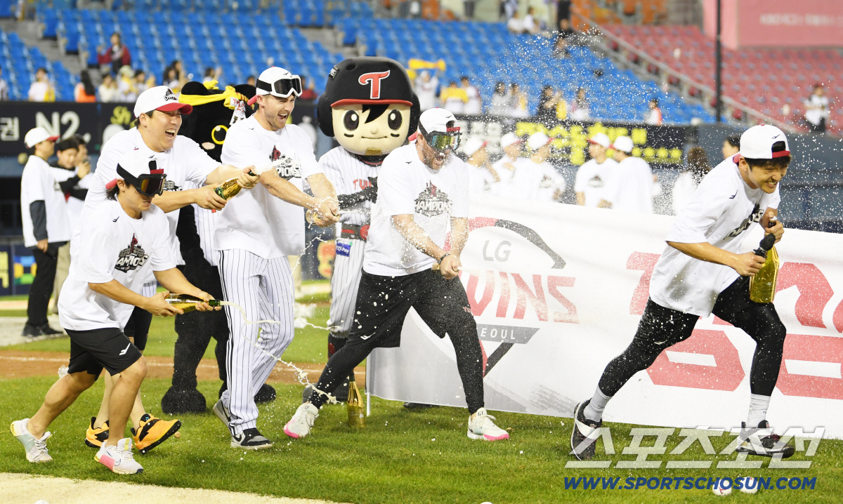 잠실구장에서 경기를 지켜보던 LG 선수들은 SSG의 역전승으로 정규시즌 우승이 확정되자 그라운드에 나와 우승의 기쁨을 나눴다.