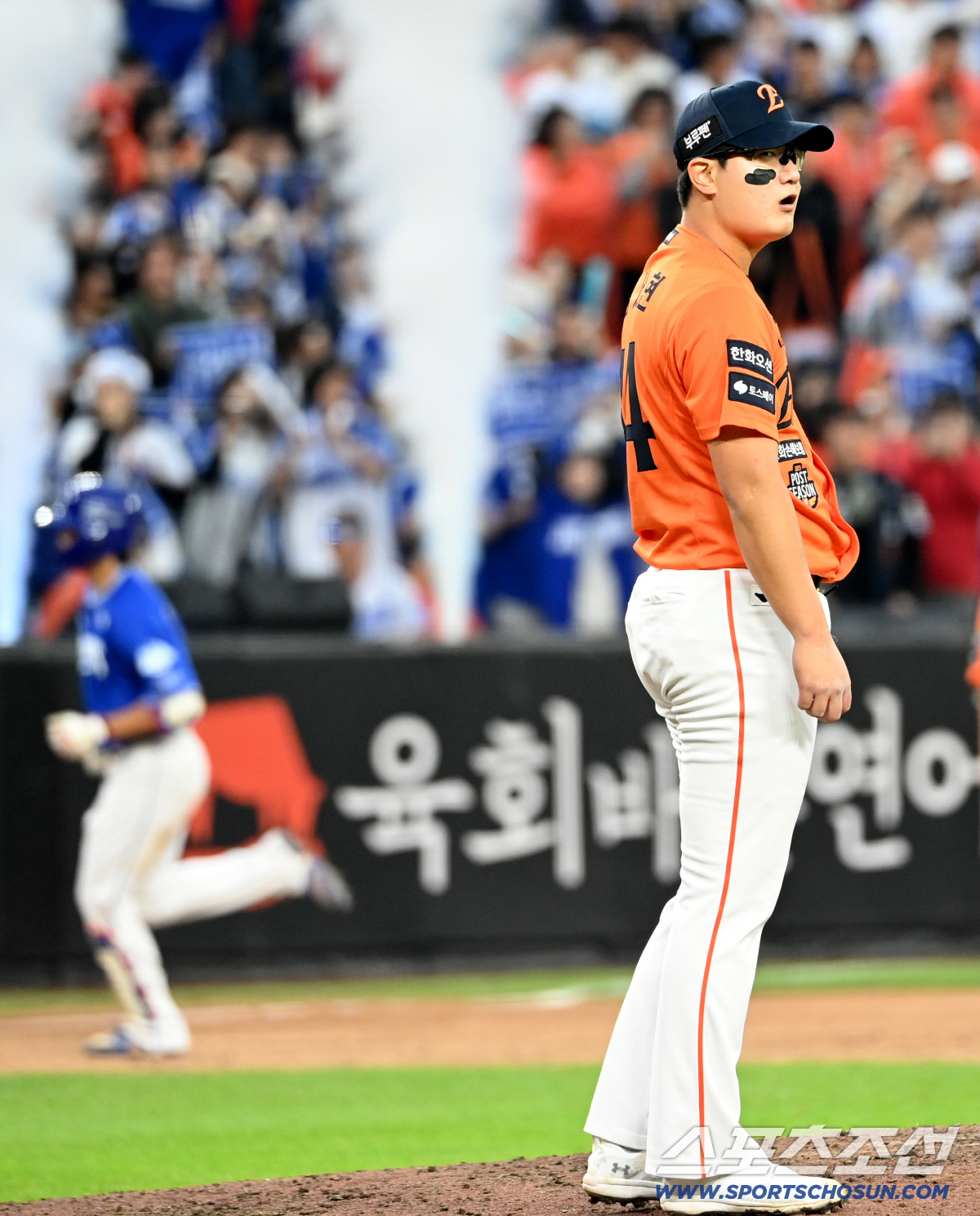 18일 대전한화생명볼파크에서 열린 삼성과 한화의 PO 1차전. 9회초 김서현이 이재현에 솔로홈런을 허용하며 아쉬워하고 있다. 대전=허상욱 기자wook@sportschosun.com/2025.10.18/