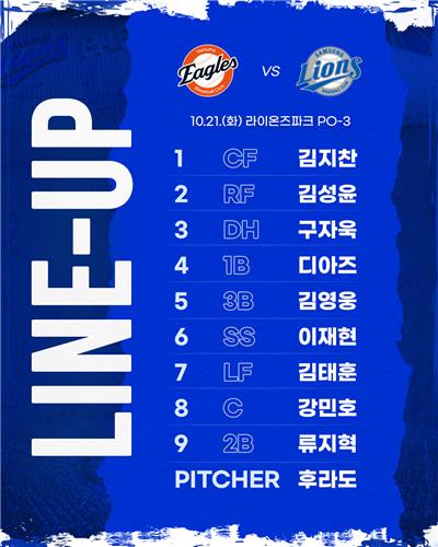 삼성은 21일 대구 삼성라이온즈파크에서 열리는 신한 SOL뱅크 KBO 포스트시즌 PO(5전 3승제) 3차전 한화 이글스와 홈 경기에 김지찬(중견수), 김성윤(우익수), 구자욱(지명타자), 르윈 디아즈(1루수), 김영웅(3루수), 이재현(유격수), 김태훈(좌익수), 강민호(포수), 류지혁(2루수) 순으로 타순을 짰다.
