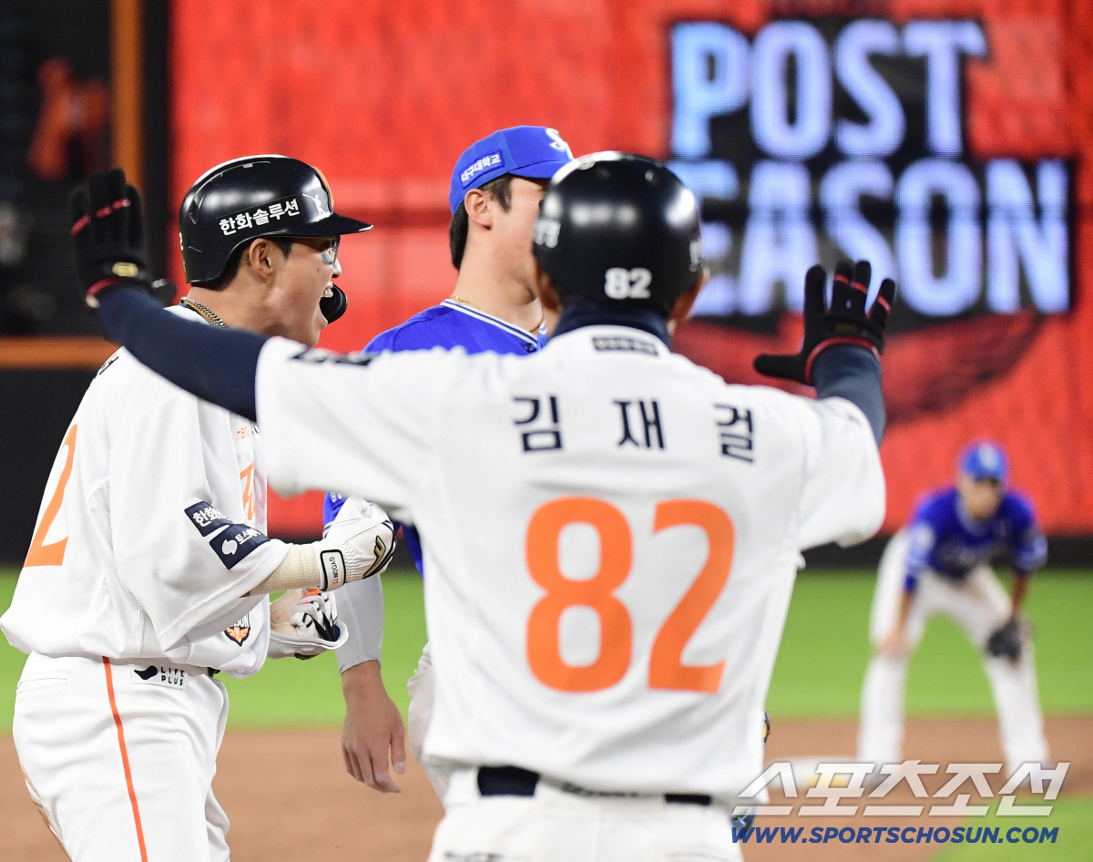 24일 대전 한화생명볼파크에서 열린 삼성과 한화의 PO 5차전. 3회말 1타점 2루타 후 볼 빠진 사일 3루까지 내달린 채은성. 대전=송정헌 기자songs@sportschosun.com