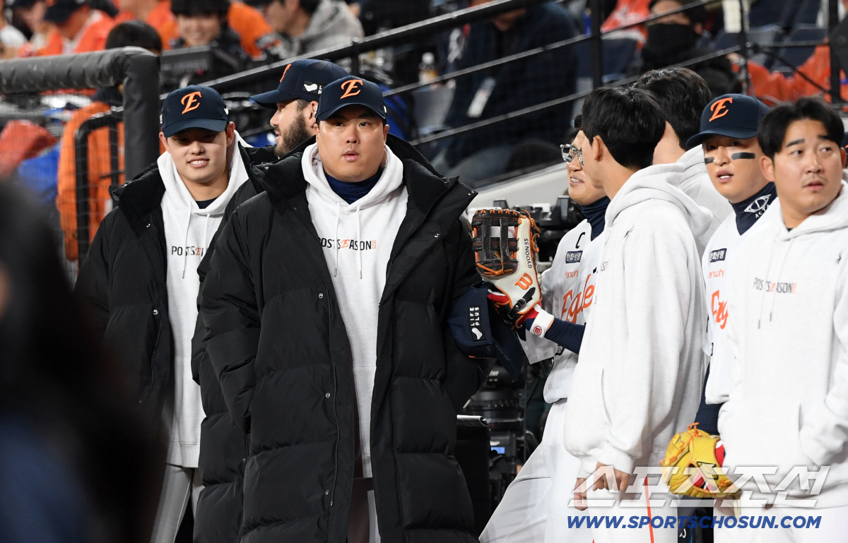 30일 대전 한화생명볼파크에서 열린 한국시리즈 4차전 한화 이글스와 LG 트윈스의 경기. 한화 문동주, 폰세, 류현진이 경기를 준비하고 있다. 대전=박재만 기자 pjm@sportschosun.com