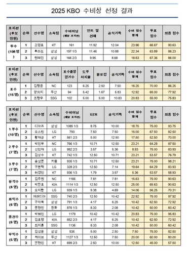 중견수는 LG 박해민(95.83점), 우익수는 삼성 김성윤(82.5점)이 수상자가 됐다.