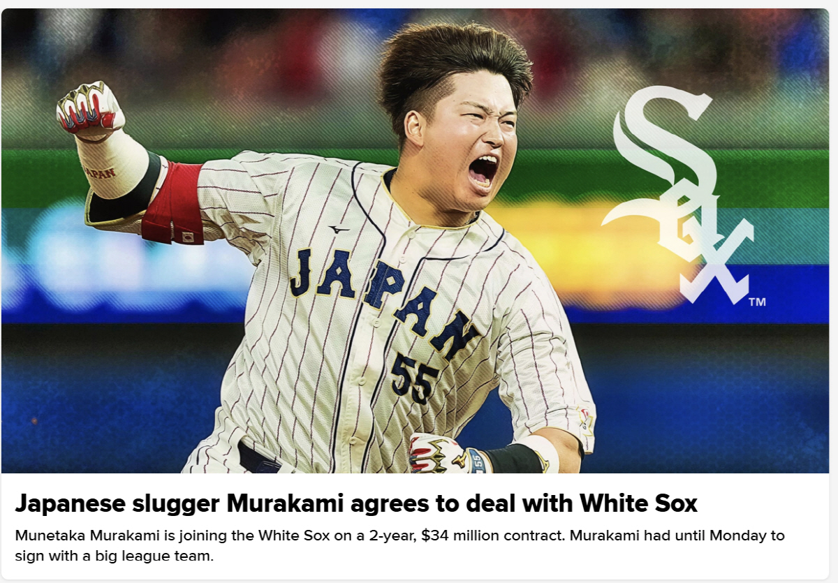 메이저리그(MLB) 구단들의 기준점은 엄격했다. 아무리 일본 프로야구(NPB)를 지배했던 거포라고 해도, MLB 무대에서는 잘 안 터질 가능성이 크다고 판단했다. 결국 1억 달러가 넘는 초대형 계약을 제시한 팀은 없었다. '포스팅 대박'을 노리던 일본 최고의 홈런타자 무라카미 무네타카 앞에 놓인 건 리그 최약체 팀으로 평가받는 시카고 화이트삭스가 제시한 2년-3400만달러(약 504억원)짜리 단기 계약 뿐이었다.