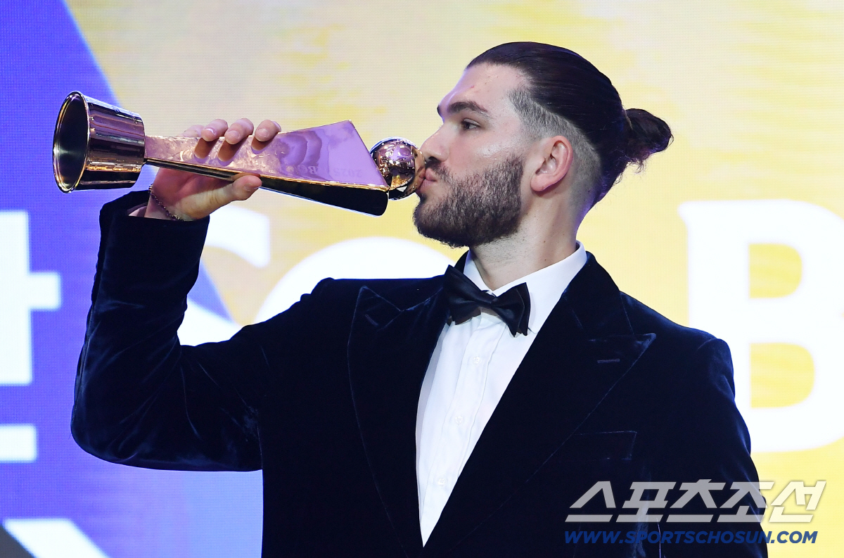 24일 오후 서울 송파구 롯데호텔에서 2025KBO시상식이 열렸다. MVP에 뽑힌 폰세가 트로피에 입 맞추고 있다. 정재근 기자 cjg@sportschosun.com/2025.11.24/