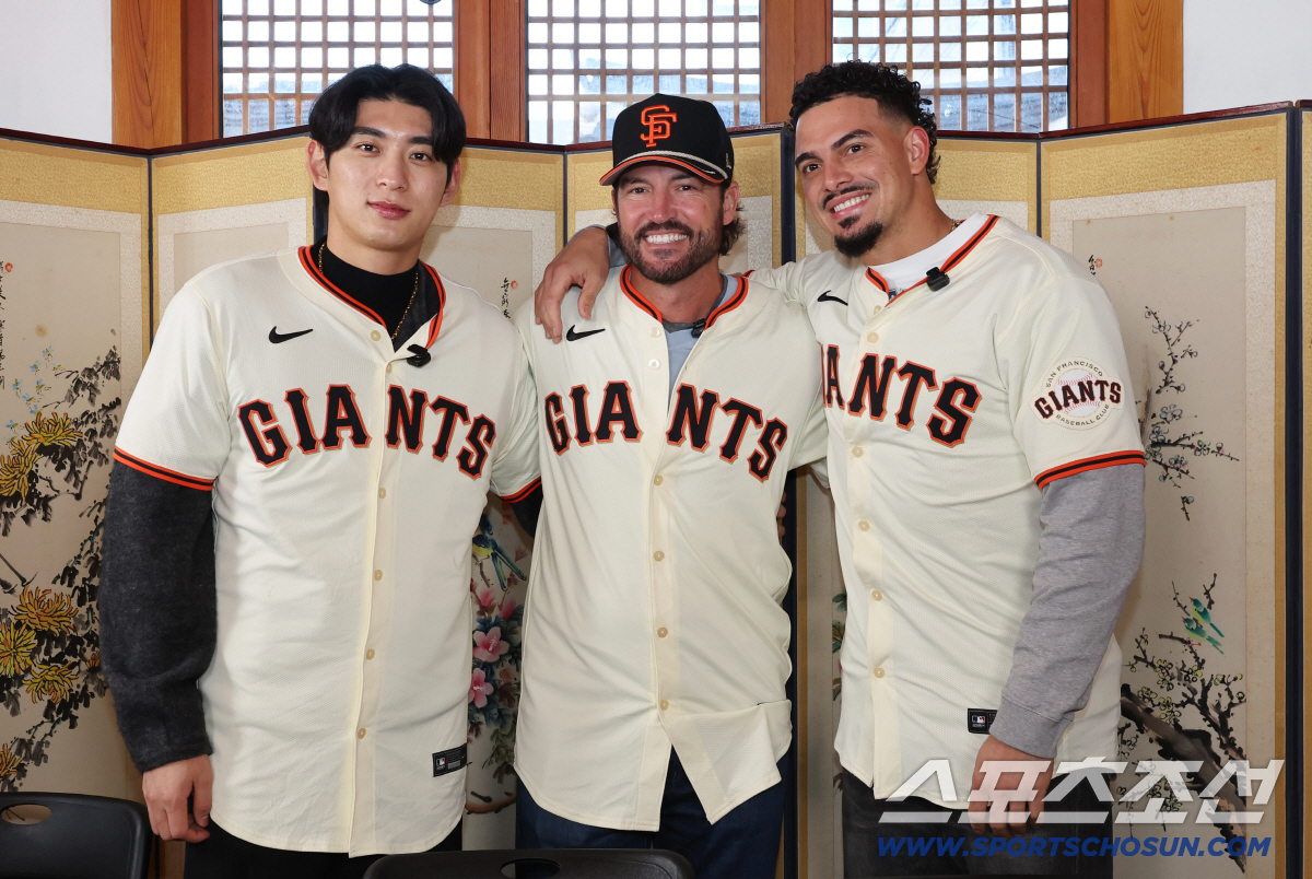 미국 메이저리그 샌프란시스코 자이언츠 이정후가 6일 서울 종로구 누하동에서 샌프란시스코 자이언츠 토니 비텔로 감독(가운데), 윌리 아다메스(오른쪽)와 한국문화체험에 앞서 기념 포즈를 취하고 있다. 누하동=송정헌 기자songs@sportschosun.com/2026.01.06/