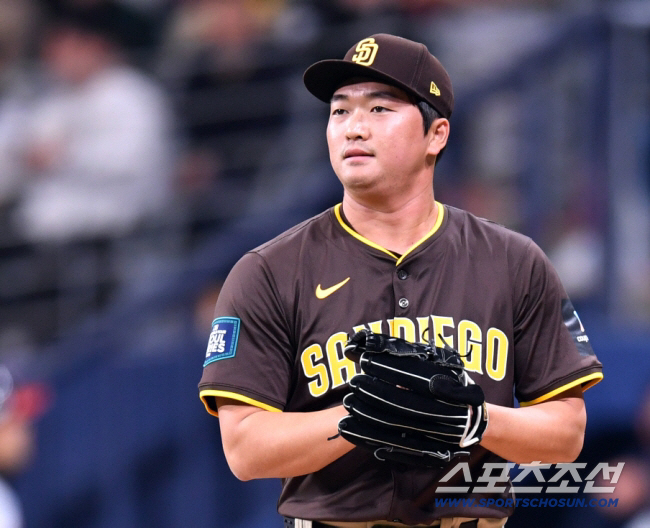 18일 서울 고척스카이돔에서 열린 'MLB 월드투어 서울 시리즈 2024' 샌디에이고 파드리스와 LG 트윈스의 경기. 9회말 1사 1루에서 샌디에이고 고우석이 LG 이재원에 투런포를 허용한 후 아쉬워하고 있다. 고척=정재근 기자 cjg@sportschosun.com/2024.3.18/
