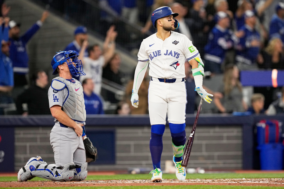 epa12498314 Toronto Blue Jays Bo Bichette (R) follows through with a three run home run off Los Angeles Dodgers two-way player Shohei Ohtani as Los Angeles Dodgers catcher Will Smith (C) and home plate umpire Jordan Bakker (L) look on during the third inning of the MLB World Series game seven between the Los Angeles Dodgers and the Toronto Blue Jays in Toronto, Canada, 01 November 2025. EPA/EDUARDO LIMA