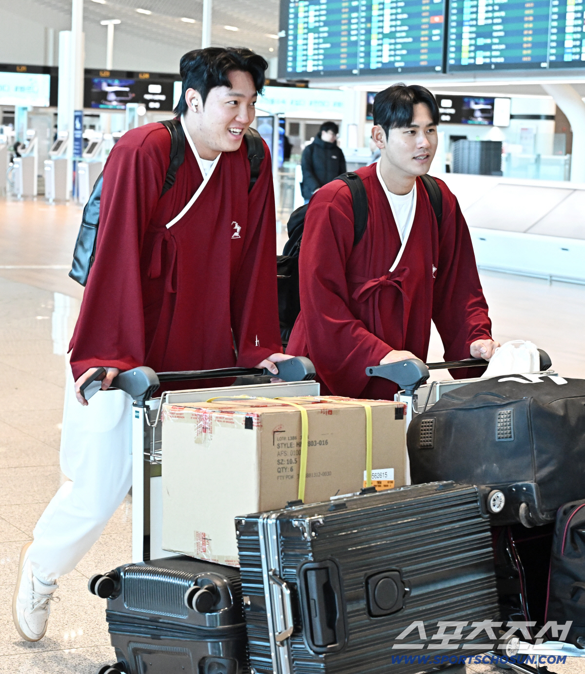 22일 키움 히어로즈 선수단이 인천공항 제2터미널을 통해 전지훈련을 위해 출국했다. 출국을 준비하고 있는 안우진-조영건. 인천공항=송정헌 기자songs@sportschosun.com
