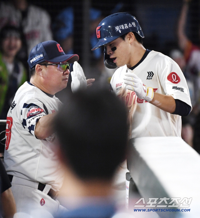 28일 부산 사직구장에서 열린 KT-롯데전. 10회말 무사 박찬형이 동점 솔로포를 친 후 김태형 감독의 환영을 받고 있다. 부산=정재근 기자 cjg@sportschosun.com/2025.8.28/
