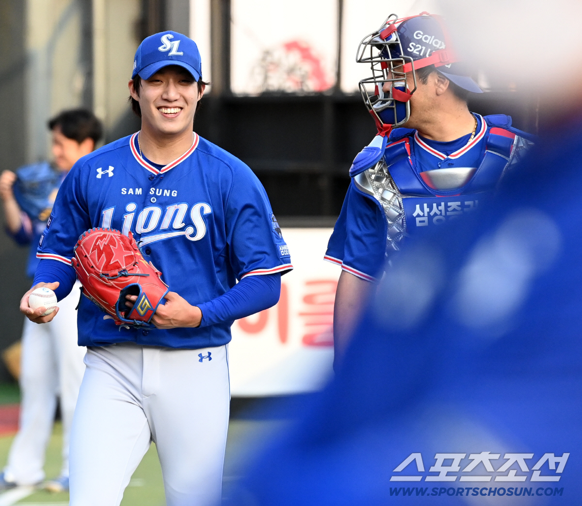 2021 KBO리그 삼성 라이온즈와 KT 위즈의 경기가 13일 수원 KT위즈파크에서 열렸다. 경기 전 삼성 선발투수 원태인이 불펜투구를 마친 후 강민호와 이야기를 나누고 있다. 수원=허상욱 기자 wook@sportschosun.com/2021.05.13/
