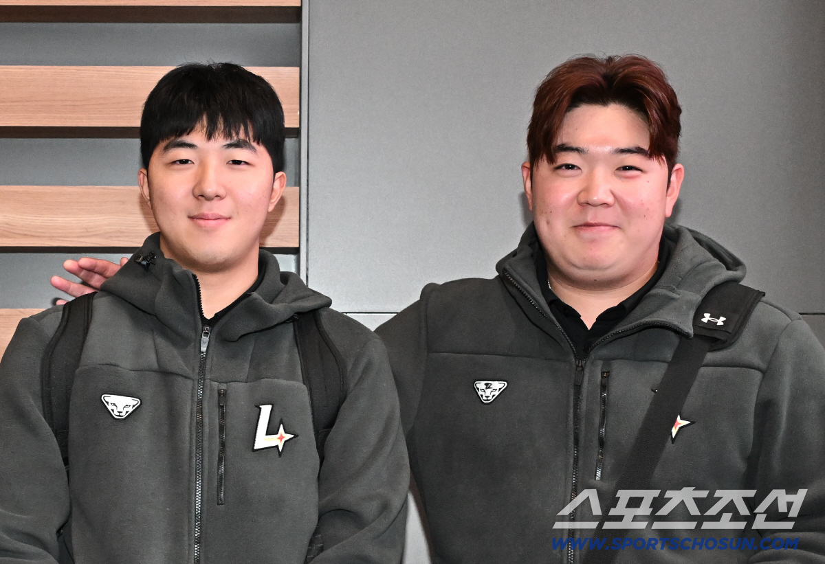 23일 SSG 랜더스 선수단이 인천공항 제2터미널을 통해 전지훈련을 위해 출국했다. SSG 이로운이 대구고 후배 김민준(왼쪽)과 함께 포즈를 취하고 있다. 인천공항=송정헌 기자songs@sportschosun.com