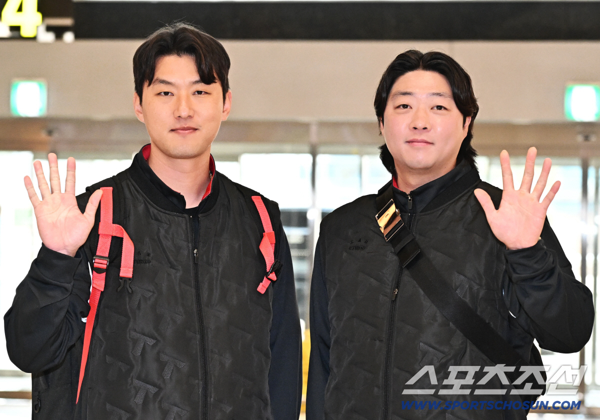 23일 오후 KIA 타이거즈 선수단이 김포공항을 통해 전지훈련이 열리는 일본으로 출국했다. 함께 포즈를 취하고 있는 KIA 홍건희, 김범수. 김포공항=송정헌 기자songs@sportschosun.com