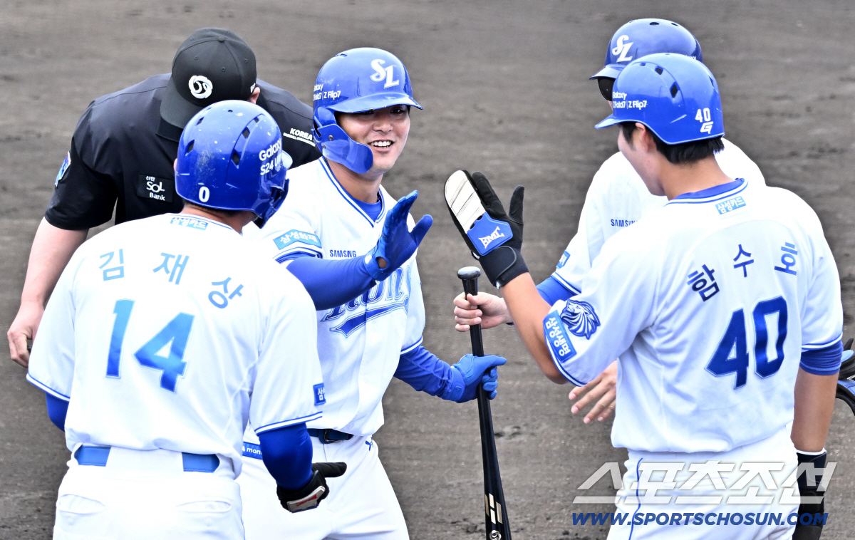 20일 일본 오키나와 온나손 아카마 구장에서 열린 대한민국 야구 대표팀과 삼성 라이온즈의 평가전, 양우현이 스리런포를 날린 뒤 환호하고 있다. 오키나와(일본)=박재만 기자 pjm@sportschosun.com./2026.02.20/