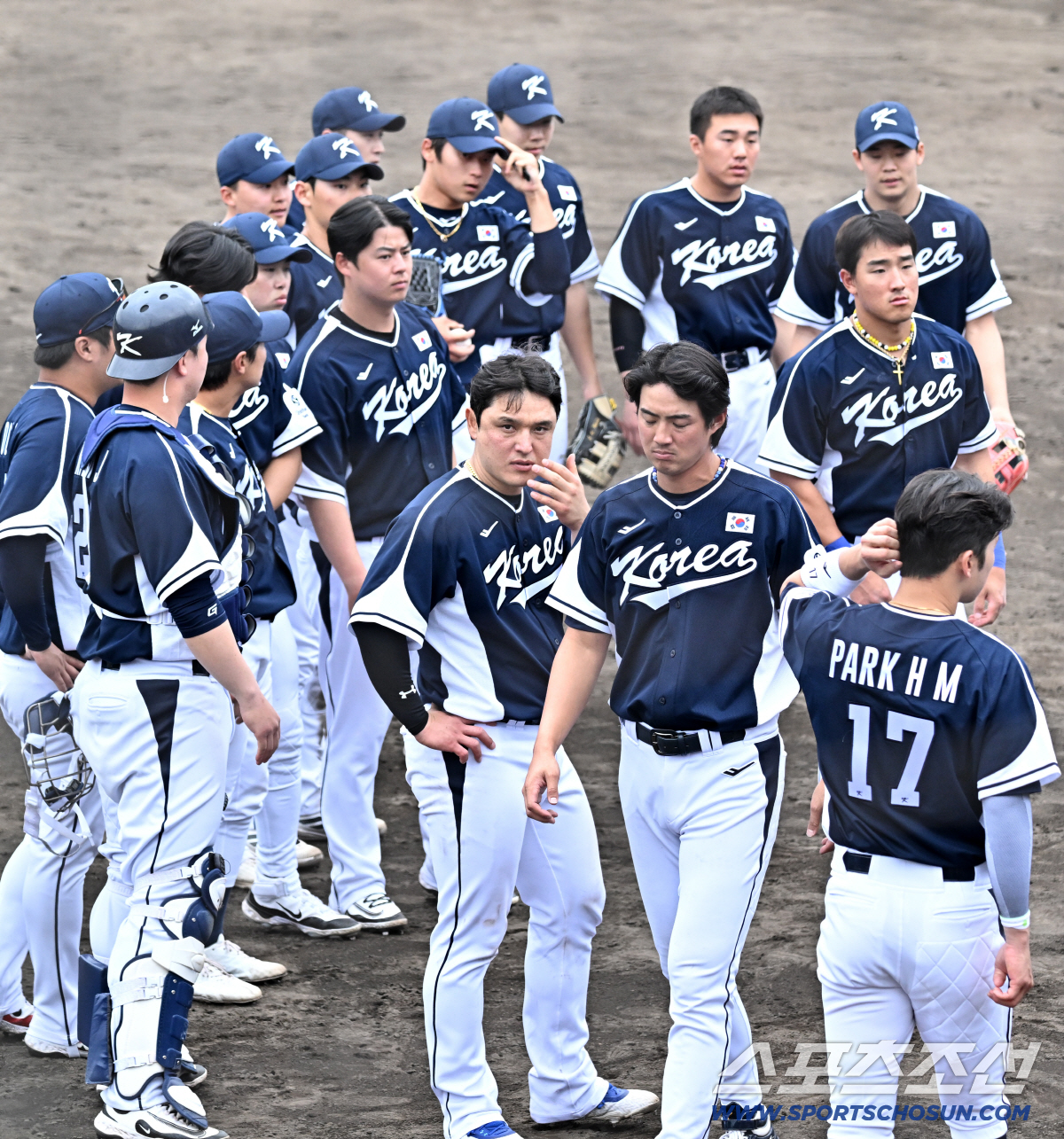 20일 일본 오키나와 온나손 아카마 구장에서 열린 대한민국 야구 대표팀과 삼성 라이온즈의 평가전, 4대3 패한 대표팀 선수들이 미팅을 갖고 있다. 오키나와(일본)=박재만 기자 pjm@sportschosun.com./2026.02.20/