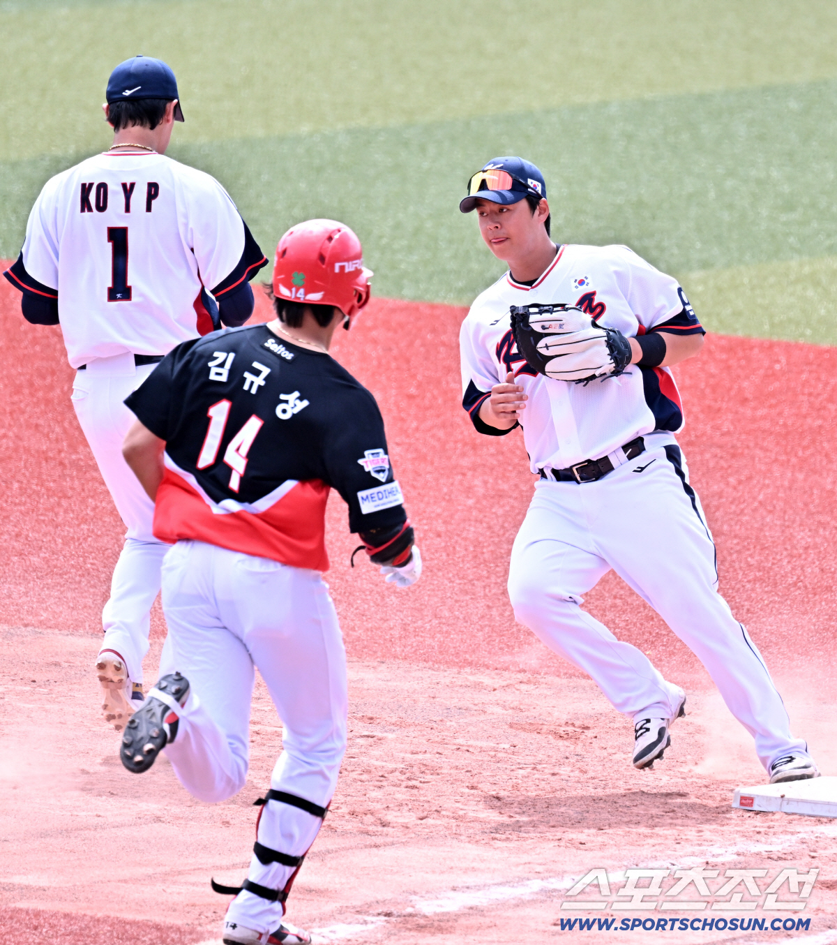 24일 일본 오키나와 가데나 구장에서 열린 야구 대표팀과 KIA 타이거즈의 평가전. 대표팀 1루수 노시환이 KIA 김규성을 땅볼 처리하고 있다. 오키나와(일본)=박재만 기자 pjm@sportschosun.com