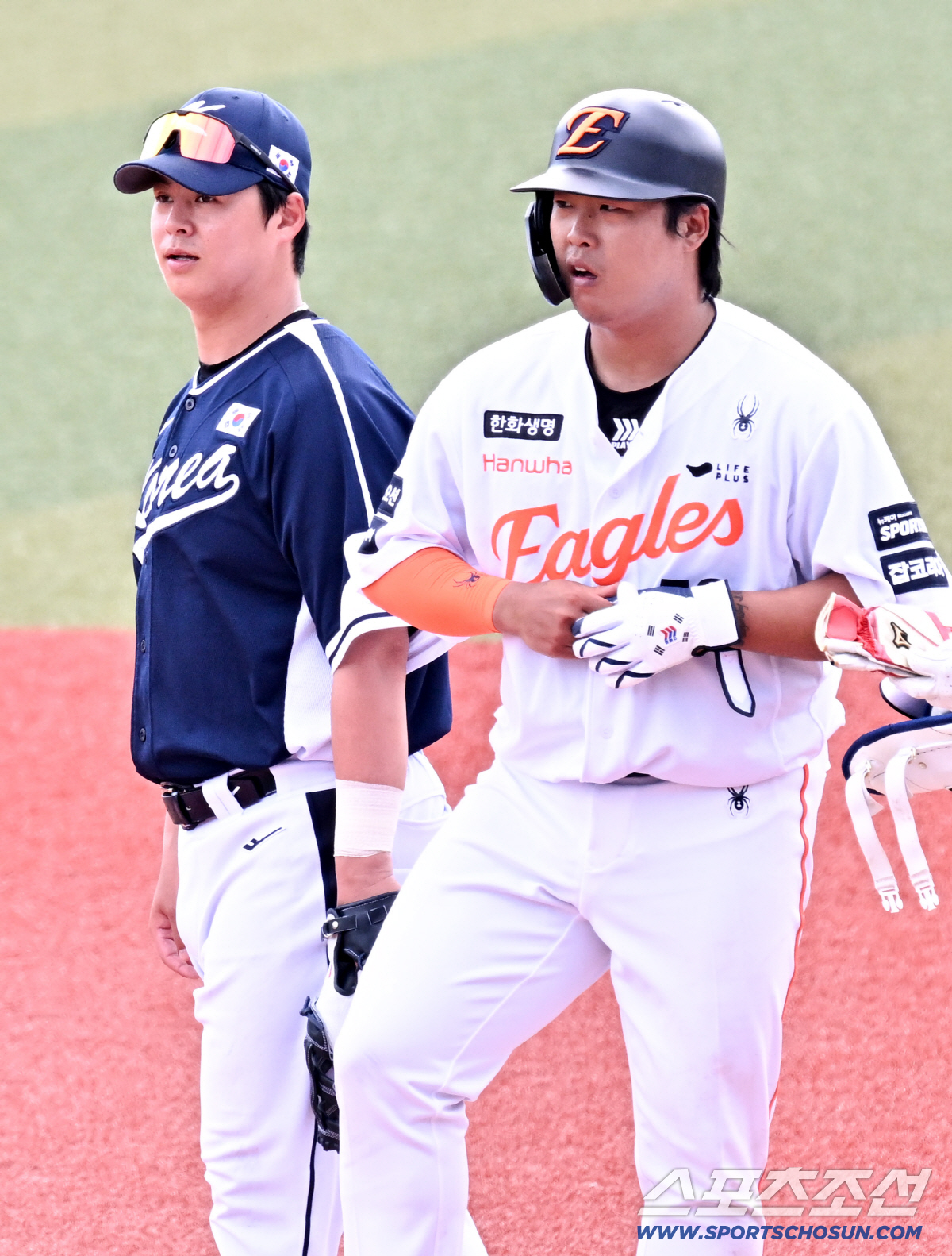 23일 일본 오키나와 가데나 구장에서 열린 야구 대표팀과 한화 이글스의 평가전. 대표팀 1루수 노시환이 한화 강백호가 출루하자 인사를 나누고 있다. 오키나와(일본)=박재만 기자 pjm@sportschosun.com/2026.02.23/