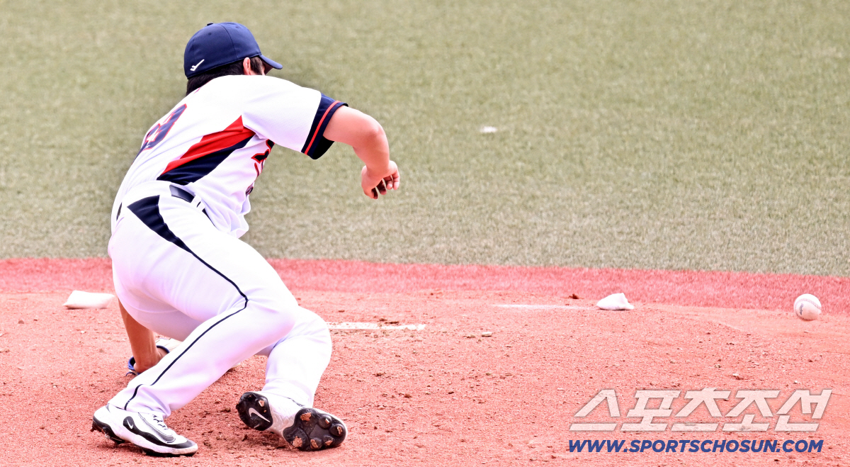 24일 일본 오키나와 가데나 구장에서 열린 야구 대표팀과 KIA 타이거즈의 평가전. 5회초 1사 KIA 데일 강습 타구를 막아낸 김택연이 수비를 펼치고 있다. 오키나와(일본)=박재만 기자 pjm@sportschosun.com