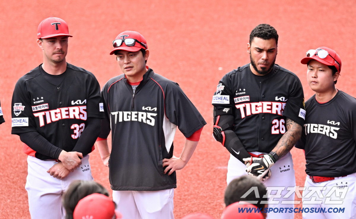 24일 일본 오키나와 가데나 구장에서 열린 야구 대표팀과 KIA 타이거즈의 평가전. 경기 종료 후 KIA 데일, 카스트로가 미팅을 갖고 있다. 오키나와(일본)=박재만 기자 pjm@sportschosun.com