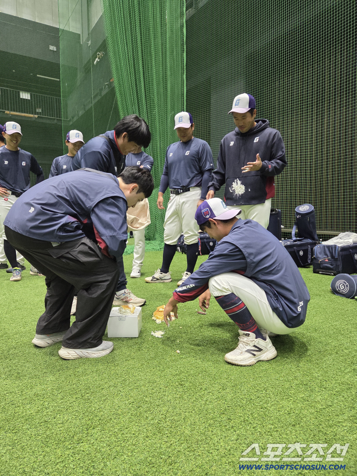 황성빈은 케이크를 전준우의 얼굴에 묻히려는 시늉을 하다가 멈췄다. 케이크가 미끄러져서 바닥에 뚝 떨어졌다.