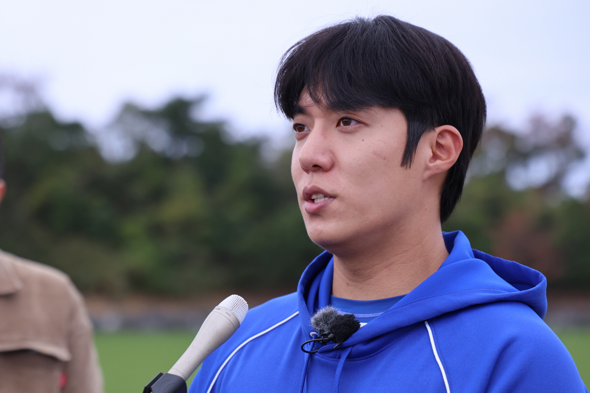 20일 일본 오키나와 온나손 아카마 구장에서 열린 대한민국 야구 대표팀과 삼성 라이온즈의 평가전, 원태인이 인터뷰를 하고 있다. 오키나와(일본)=박재만 기자 pjm@sportschosun.com./2026.02.20/