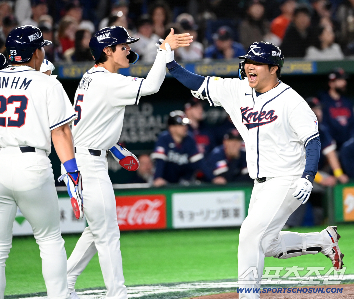 5일 일본 도쿄돔에서 열린 WBC(월드베이스볼클래식) 한국과 체코의 경기. 1회말 1사 만루 문보경이 선제 만루홈런을 치고 기쁨을 나누고 있다. 도쿄(일본)=허상욱 기자wook@sportschosun.com