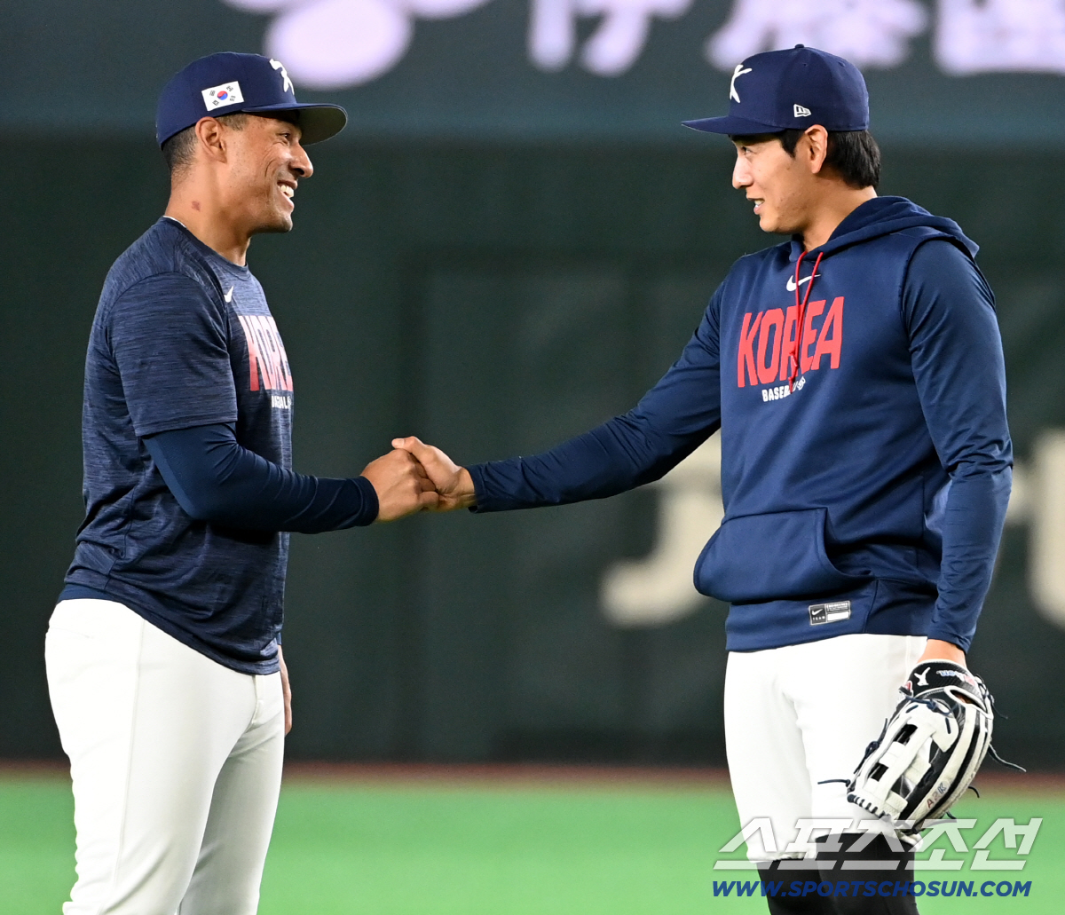 7일 일본 도쿄돔에서 열린 WBC(월드베이스볼클래식) 한국과 일본의 경기. 경기 전 자마이 존스와 이정후가 악수를 나누고 있다. 도쿄(일본)=허상욱 기자wook@sportschosun.com