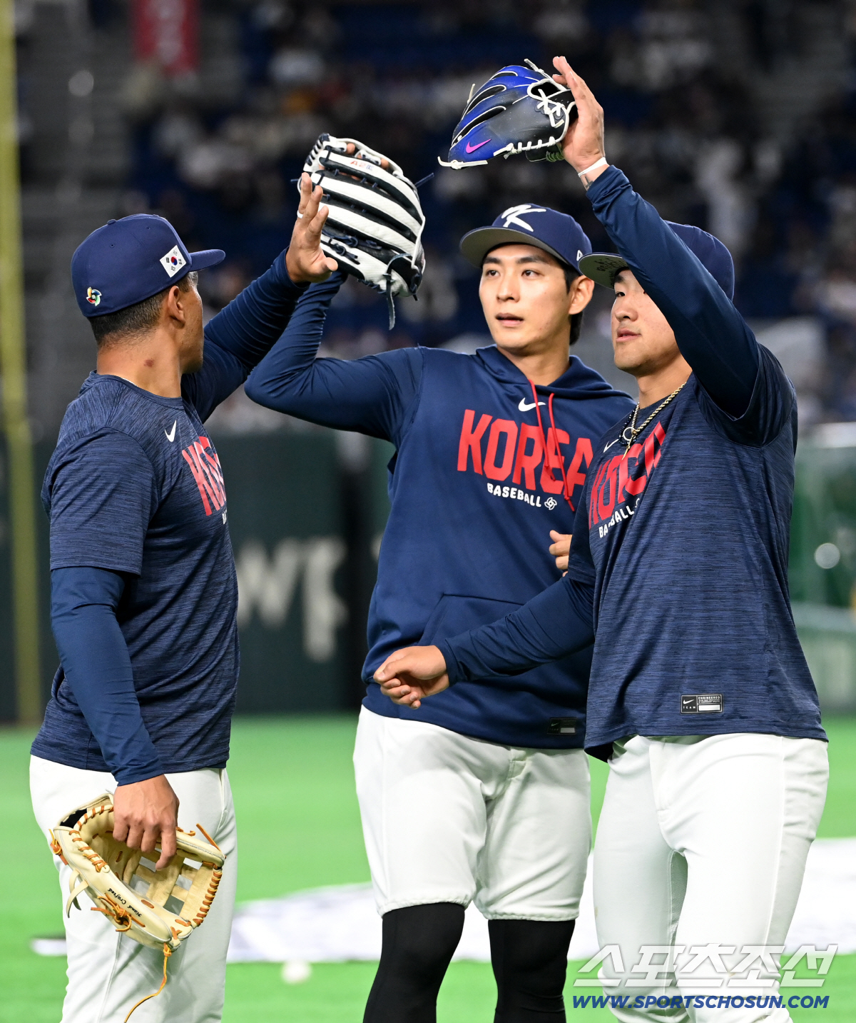 7일 일본 도쿄돔에서 열린 WBC(월드베이스볼클래식) 한국과 일본의 경기. 경기 전 자마이 존스, 이정후, 안현민이 하이파이브를 하고 있다. 도쿄(일본)=허상욱 기자wook@sportschosun.com