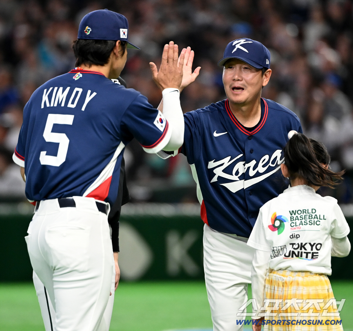 7일 일본 도쿄돔에서 열린 WBC(월드베이스볼클래식) 한국과 일본의 경기. 선수 소개때 류지현 감독이 김도영화 하이파이브를 하고 있다. 도쿄(일본)=허상욱 기자wook@sportschosun.com