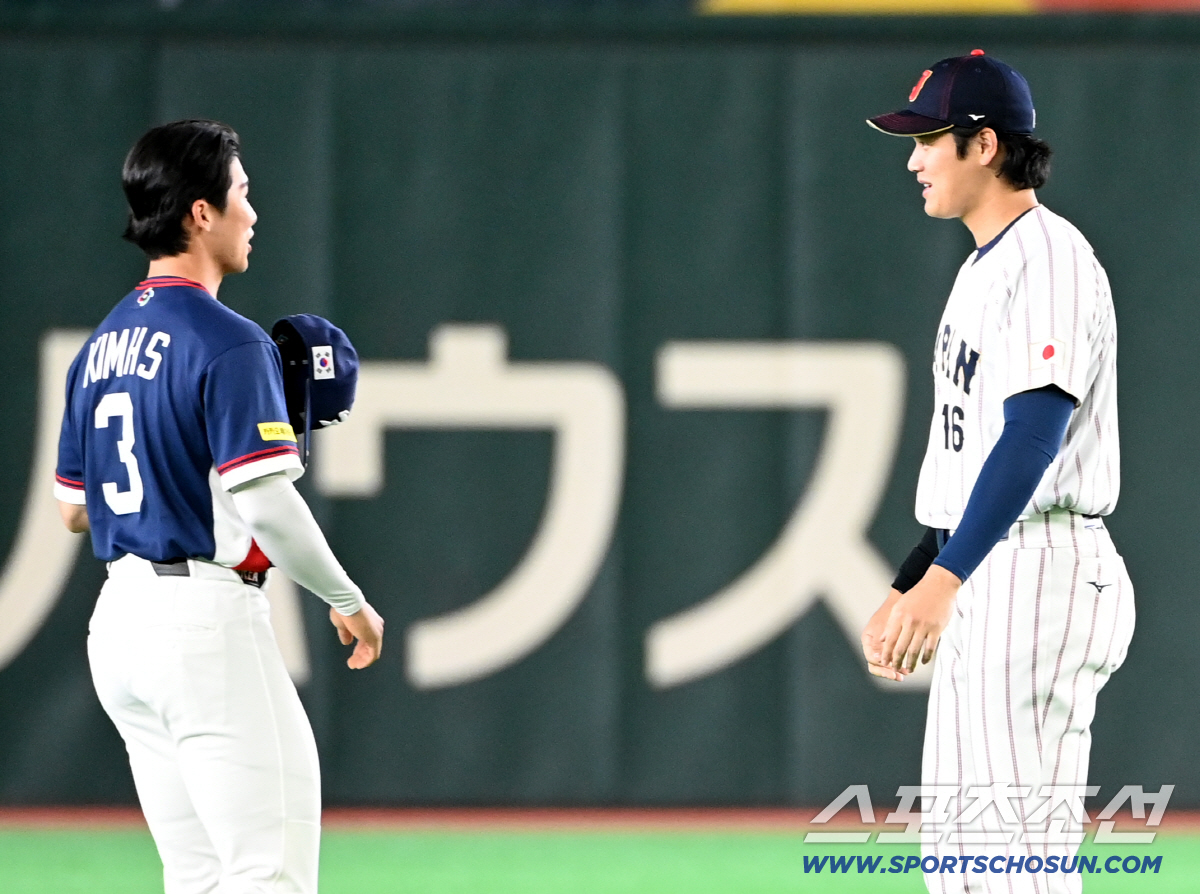 7일 일본 도쿄돔에서 열린 WBC(월드베이스볼클래식) 한국과 일본의 경기. 경기 전 오타니와 김혜성이 인사를 나누고 있다. 도쿄(일본)=허상욱 기자wook@sportschosun.com