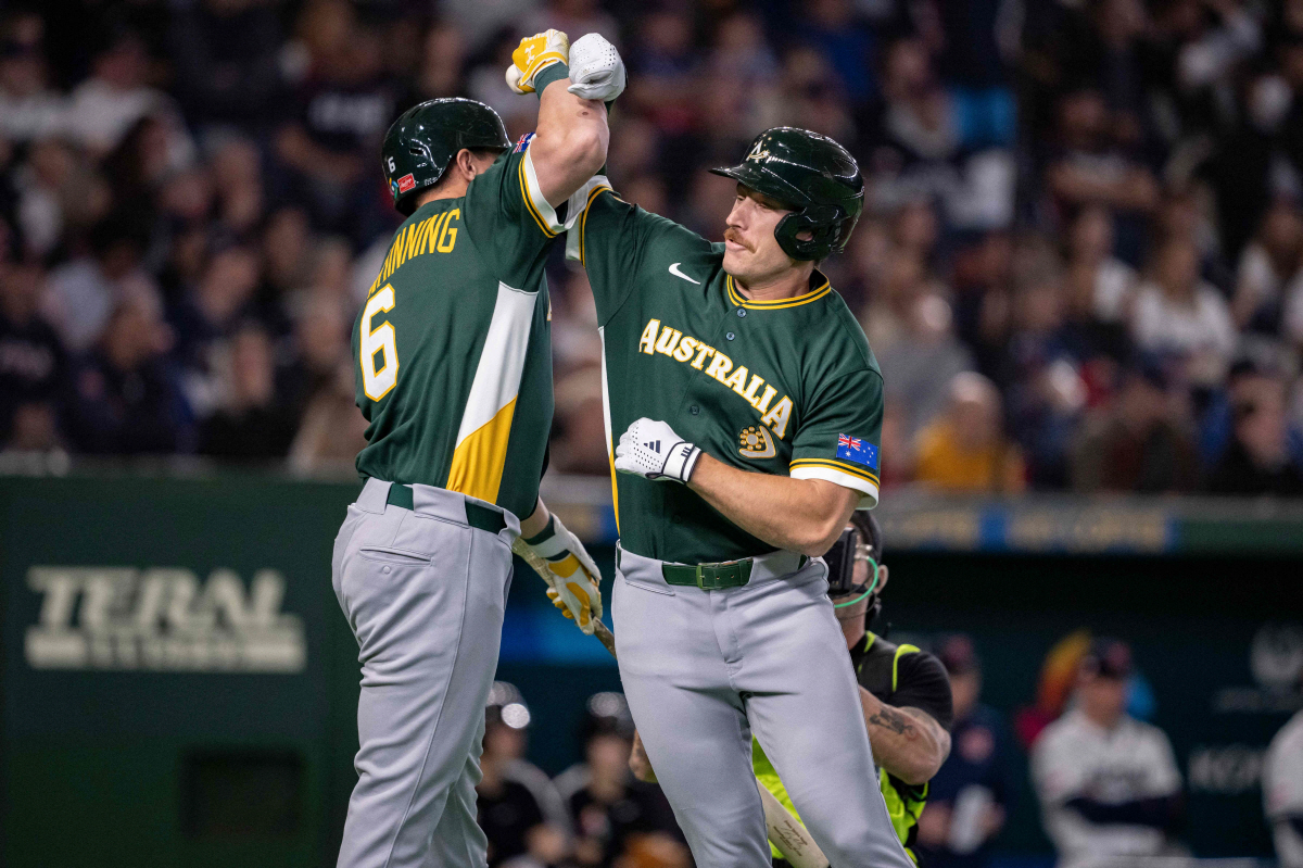 Australia's Alex Hall (R) celebrates with Robbie Glendinning after hitting a solo homerun during the World Baseball Classic (WBC) Pool C first round game between Czech Republic and Australia at the Tokyo Dome in Tokyo on March 6, 2026. AFP연합뉴스