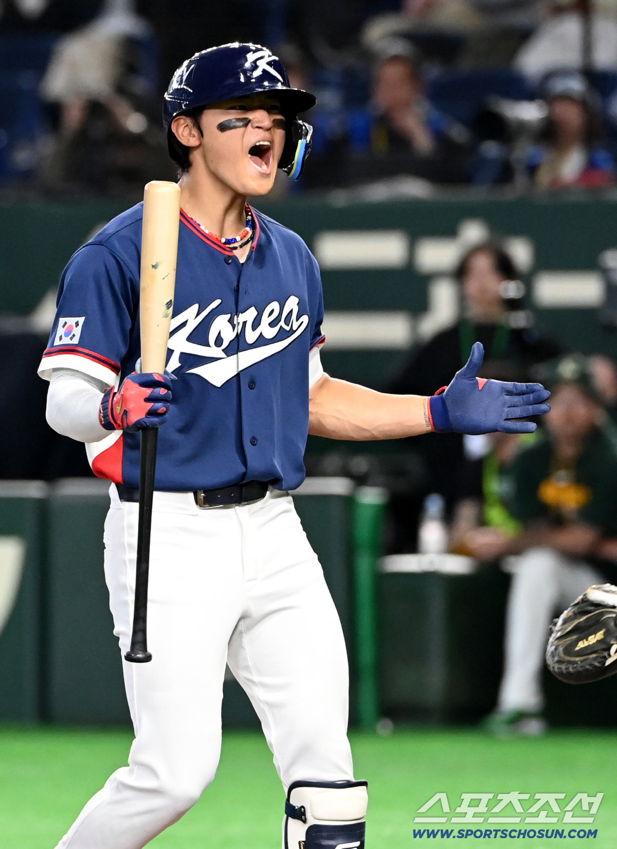 6-2로 쫓기고 맞이한 9회초. 한국은 여기서 한 점 이상을 뽑지 못하면 9회말 호주 공격 결과와 상관없이 8강 탈락 확정이었다. 선두타자로 나선 김도영은 볼넷을 얻은 뒤 한국 덕그아웃을 바라보며 포효했다. 200% 임무를 해낸 김도영은 대주자 박해민과 교체됐다.