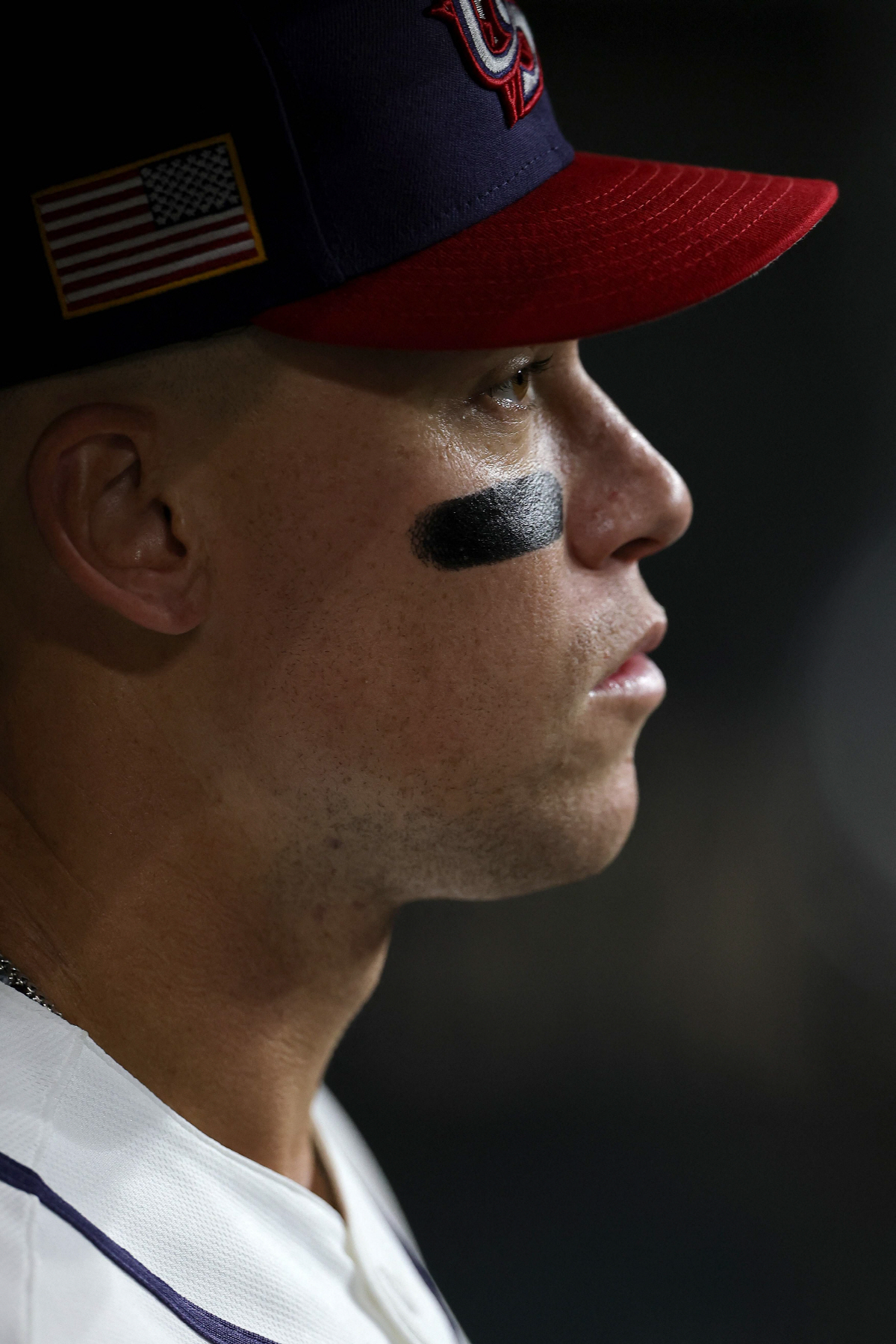 미국 캡틴 애런 저지가 11일(한국시각) 다이킨파크에서 열린 B조 이탈리아와의 최종전을 앞두고 심각한 표정으로 그라운드를 주시하고 있다. AFP연합뉴스